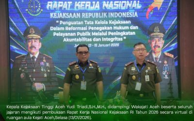 Aceh, (teropongnasionalnews) Kepala Kejaksaan Tinggi Aceh Yudi Triadi,S.H.,M.H., didampingi Wakajati Aceh beserta seluruh jajaran mengikuti pembukaan Rapat Kerja Nasional Kejaksaan RI Tahun 2026 secara virtual di ruangan aula Kejati Aceh,Selasa (13/01/2026). Rakernas 2026 ini mengusung tema “penguatan Tata Kelola Kejaksaan dalam Reformasi Penegakan Hukum dan Pelayanan Publik melalui Peningkatan Akuntabilitas dan Integritas”,sejalan dengan arah …